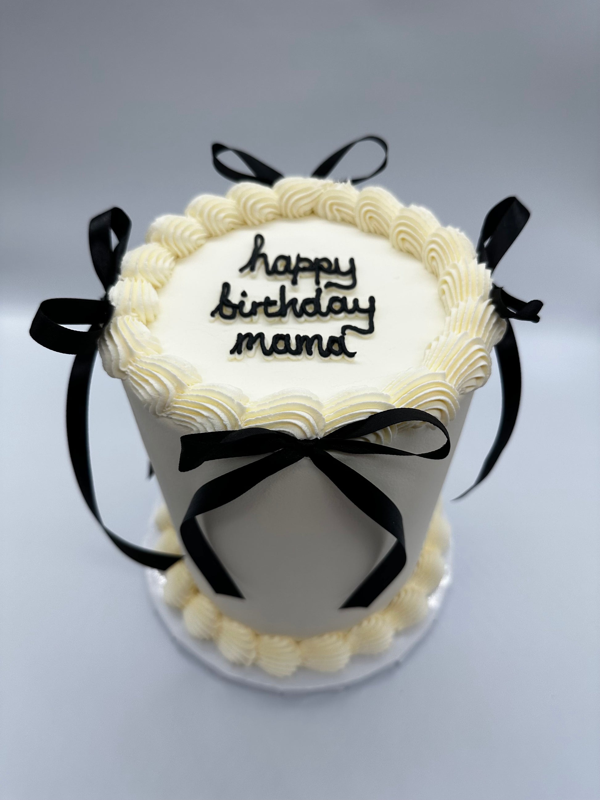Our Classic Bow Cake is 2 layer cake, perfect for any occasion while remaining our most affordable cake option. This simple round cake features a smooth buttercream finish with a delicate shell border around the top and bottom, finished with charming bows for a subtle yet stylish look.